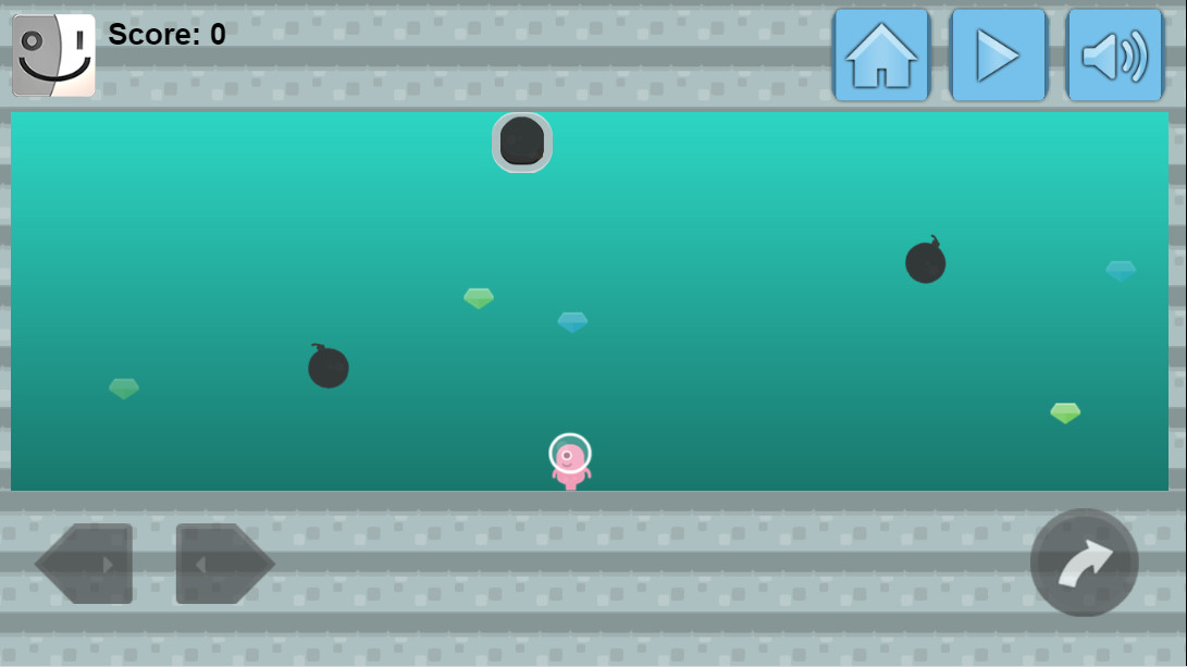 You are an alien trapped in a room with a device that throws bombs every few seconds! A bomb will explode if you touch it. Your goal is to survive in this room for as long as possible! To earn more points, you also need to collect diamonds that periodically appear in the room.
