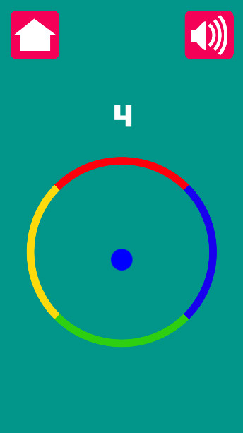 A ball is moving inside a circle, and you need to make sure it keeps doing so! Note that the ball will only keep moving if it lands on a section of the circle that matches its color. The circle has 4 sections of different colors, and the ball's color will also change randomly. You need to quickly rotate the circle so that the ball does not touch a section of a different color! Your final score will be based on how many times you hit the ball. Try to score as many points as possible!