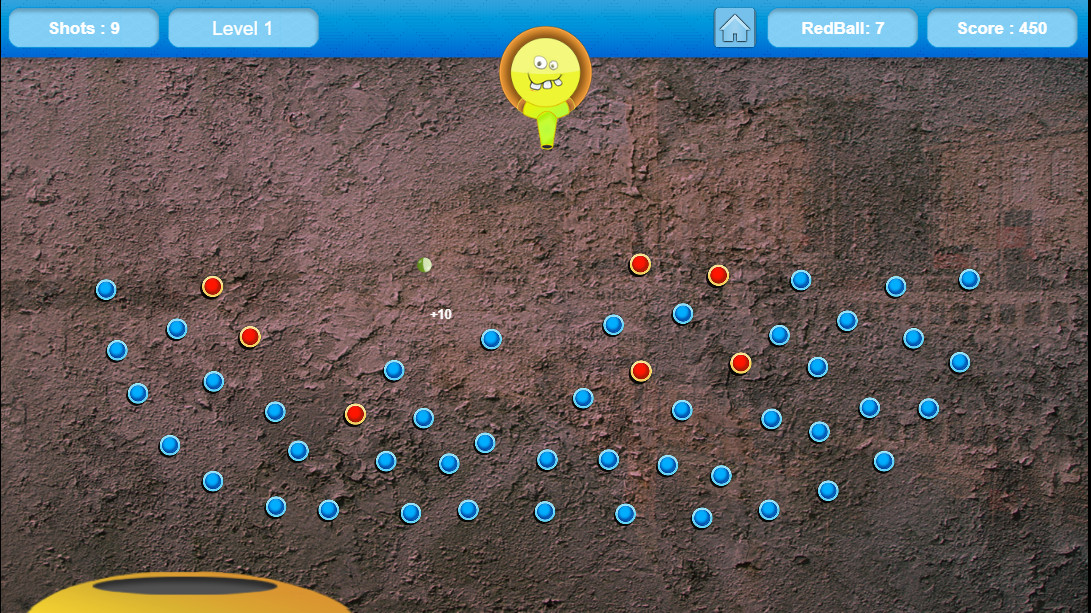 In this game you control a cannon located at the top of the screen. Below on the screen there are blue and red balls — you need to shoot and destroy the red balls. You can also destroy blue balls to earn more points, but your main goal is the red ones. At the bottom of the screen a platform moves back and forth. If the ball you shoot hits it, you will earn an extra shot. You lose if you run out of shots, so count them carefully and try to score as many points as possible!