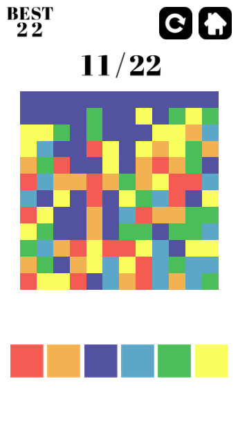 This game has simple yet interesting mechanics. You start with the top-right square and must match its color with the colors of the surrounding squares. To do this, you select a square from the bottom of the screen that matches the color of one of the surrounding squares. Six colors are used in total, and your goal is to make all the squares the same color by the end of the game — and you need to accomplish this in 22 moves or fewer!