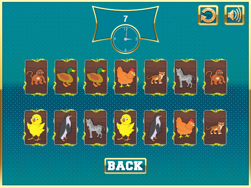 Do you have a good memory? Let's find out! This game can be very helpful in teaching young children and training their memory. The game supports sound and has 3 gameplay types, each with 3 difficulty levels — 12, 14, or 16 images. The images, words, and sounds are all related to animals. The gameplay types are: word-word, image-image, and image-word. In word-word gameplay you need to find cards with matching words; in image-image gameplay you need to find cards with matching images; and in image-word gameplay you need to match an image card with its corresponding name. When you select a card, you hear the animal's name in English. This makes the game suitable for educational purposes.