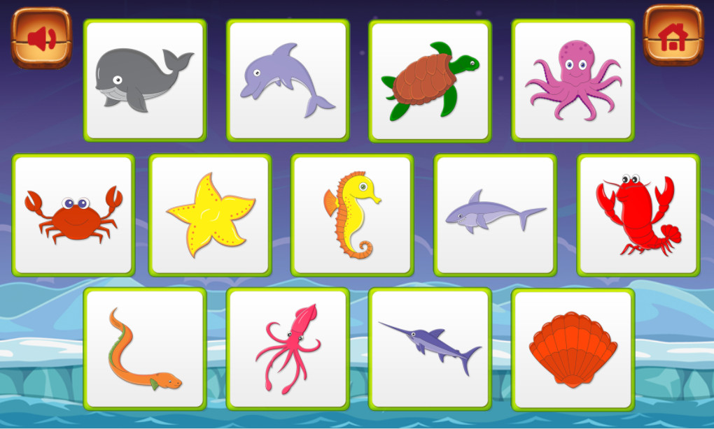 This children's game about sea creatures can be very useful for teaching young children and training their memory. The game has 4 modes: Learning – in this mode you can view all the cards and tap on them to hear the name
