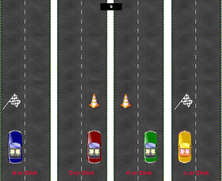 In this game you control four cars. As in other similar games, you need to collect flags, dodge obstacles, and try to go as far as possible. You lose if you miss a flag or hit an obstacle. Note that you need to control all the cars simultaneously, and that is not so easy to do!