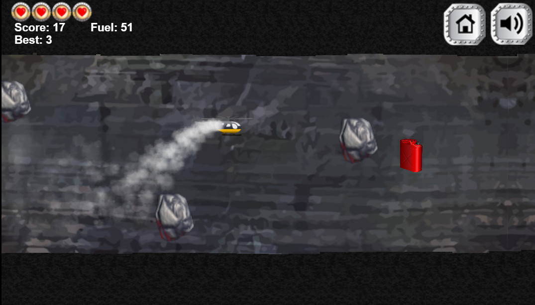 You are flying through a cave in a helicopter, and there are many obstacles in your way. Your task is to dodge these obstacles. Sound familiar? Yes, this is that very game from your childhood — just an improved version! As in the original game, the helicopter tends to fall, and you need to hold the mouse button to keep it from crashing. But don't forget about fuel! Your fuel is limited — collect it along the way, or you will lose. Download the game and find out how well you can fly a helicopter!
