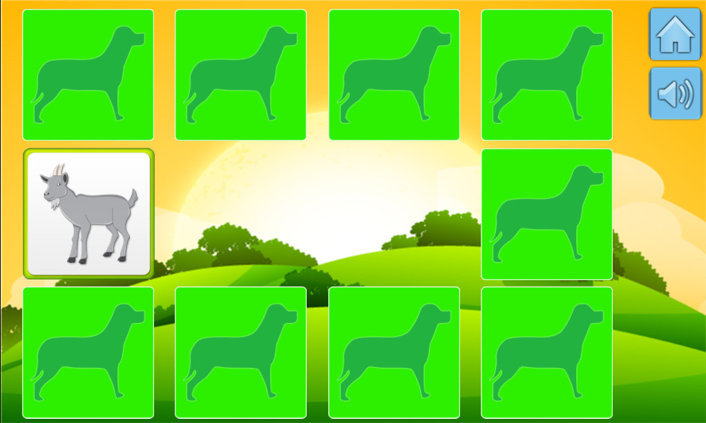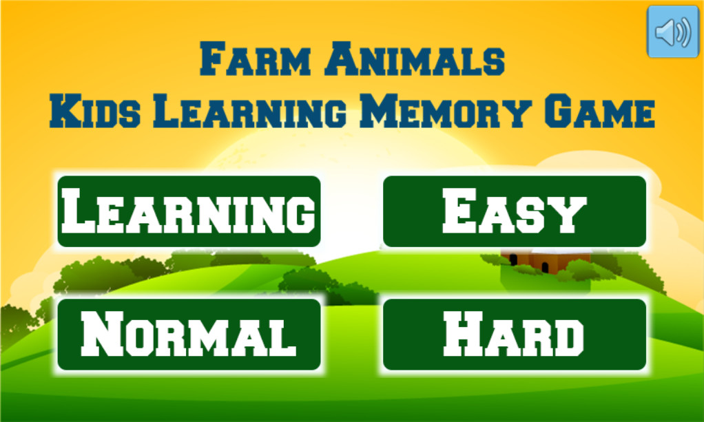 This is a children's game about farm animals. It can be useful for teaching young children and training their memory. You need to find matching pairs of cards that show the same animal. The game has three difficulty levels — Easy, Medium, and Hard. There is also a Learning mode where you can get acquainted with the animals and hear their names. The game ends when you find all the pairs on the board.