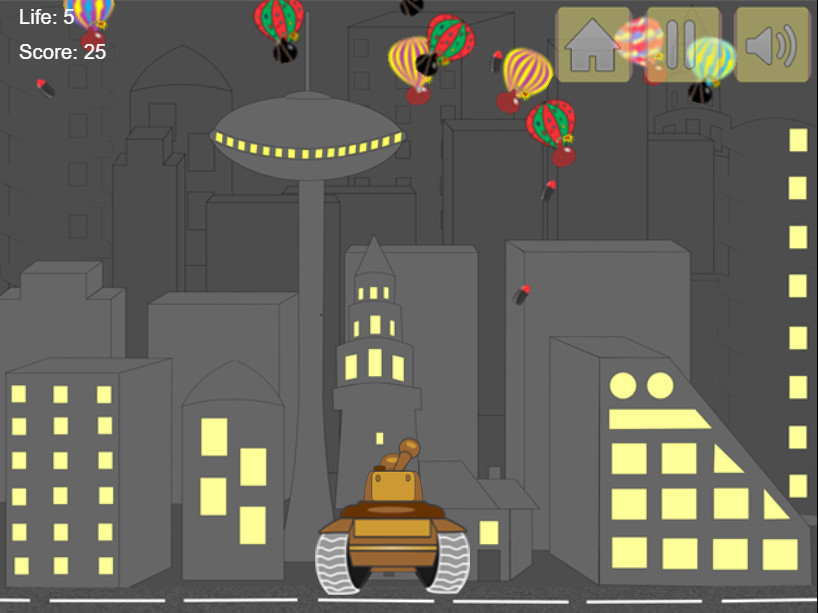 Begin the battle for the future of your people. Save your city from invaders who are trying to bomb it! As the most fearless tank commander on the front line, you need to shoot down bombs before they hit the ground. Bombs fall at different speeds, and every time a bomb lands on the ground you lose one life. Fight to the end until you run out of lives!