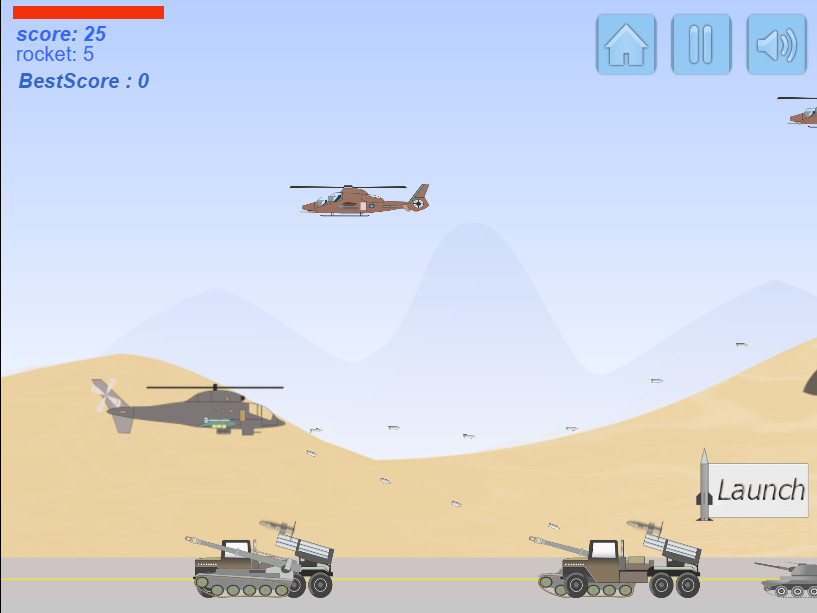 This is a classic shooter where you control a helicopter and battle enemies attacking you both from the ground and from the air. Enemies shoot bullets and rockets, and you need to dodge them. You can also destroy some rockets by shooting them. Don't forget to collect the Shield boost — it will help you block damage!