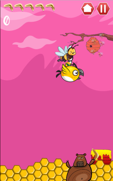 You are a hungry bear who loves honey collected by hardworking bees! Grab your boomerang, throw it at the bees, and collect their honey! Aim your boomerang at the bees as accurately as possible! Note that you are given 5 boomerangs for the game — if you don't catch the boomerang, you will lose it. The game ends when all your boomerangs are gone. Also be very careful when throwing the boomerang — don't hit the angry birds flying in the sky alongside the bees. They are very mean and grumpy, and if you hit one of them the game will end.